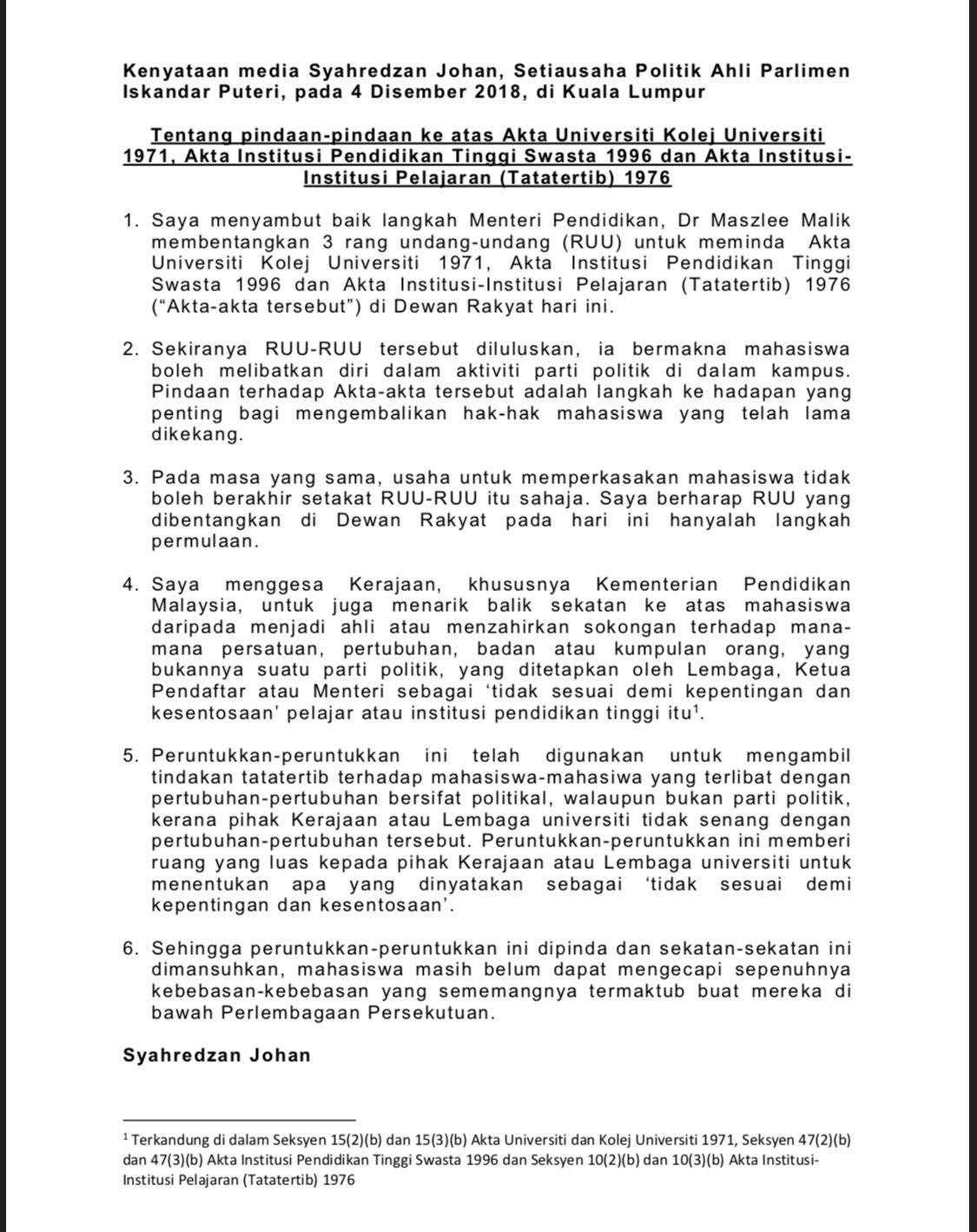 Syahredzan Johan On Twitter Kenyataan Media Tentang Pindaan Pinaan Terhadap Auku Dan 2 Lagi Akta Https T Co Szncohvrgo Twitter